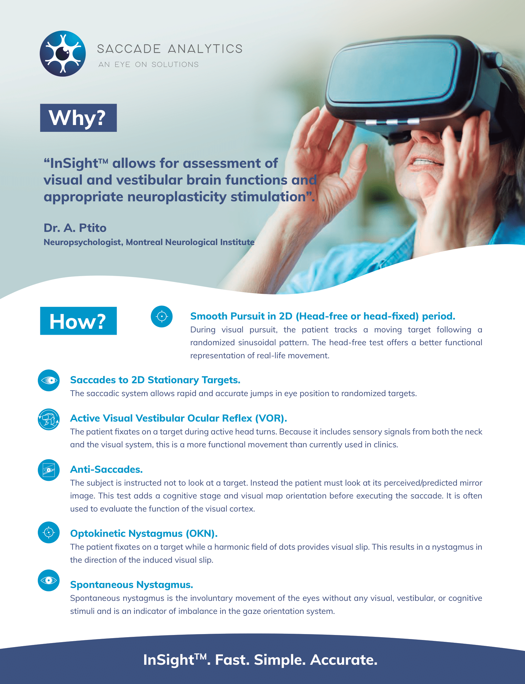 Saccade Analytics is a 10 minute test that utilizes VR eye-tracking technology to objectively measure a patient’s eyes and head while they perform 8 simple tasks. Each task is designed to test a specific brain function.