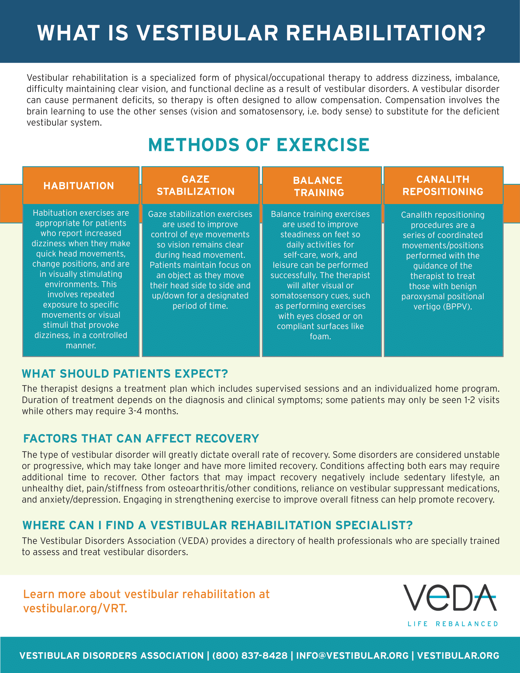 Vestibular rehabilitation therapy (VRT) involves a series of diagnostic tests and corrective exercises. The goal of VRT is to reduce symptoms of dizziness, vertigo and improve balance.